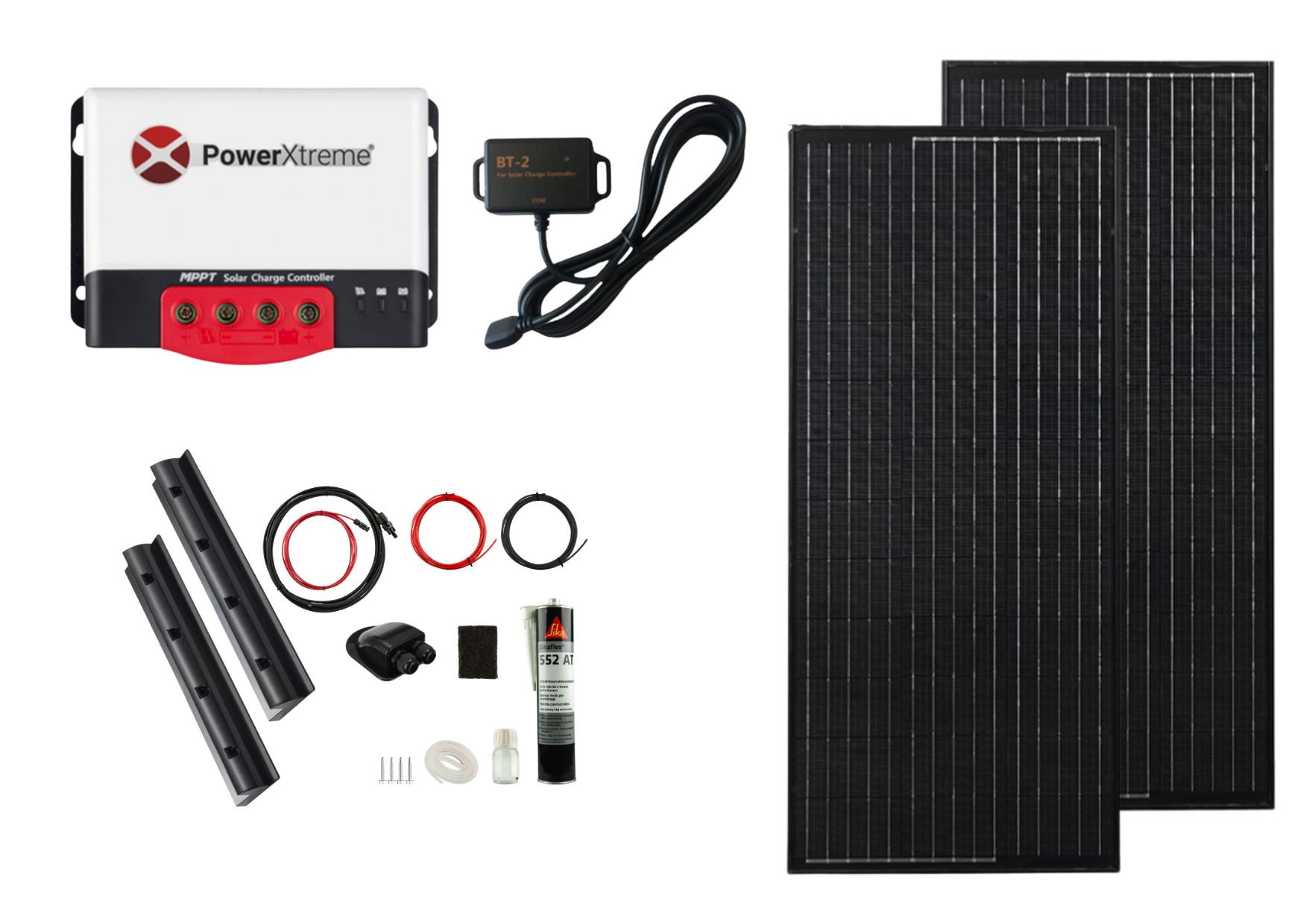 Paket mit 2 schwarze Solaranlagen von 140W, 1 MPPT Charger, 1 Bluetooth Module