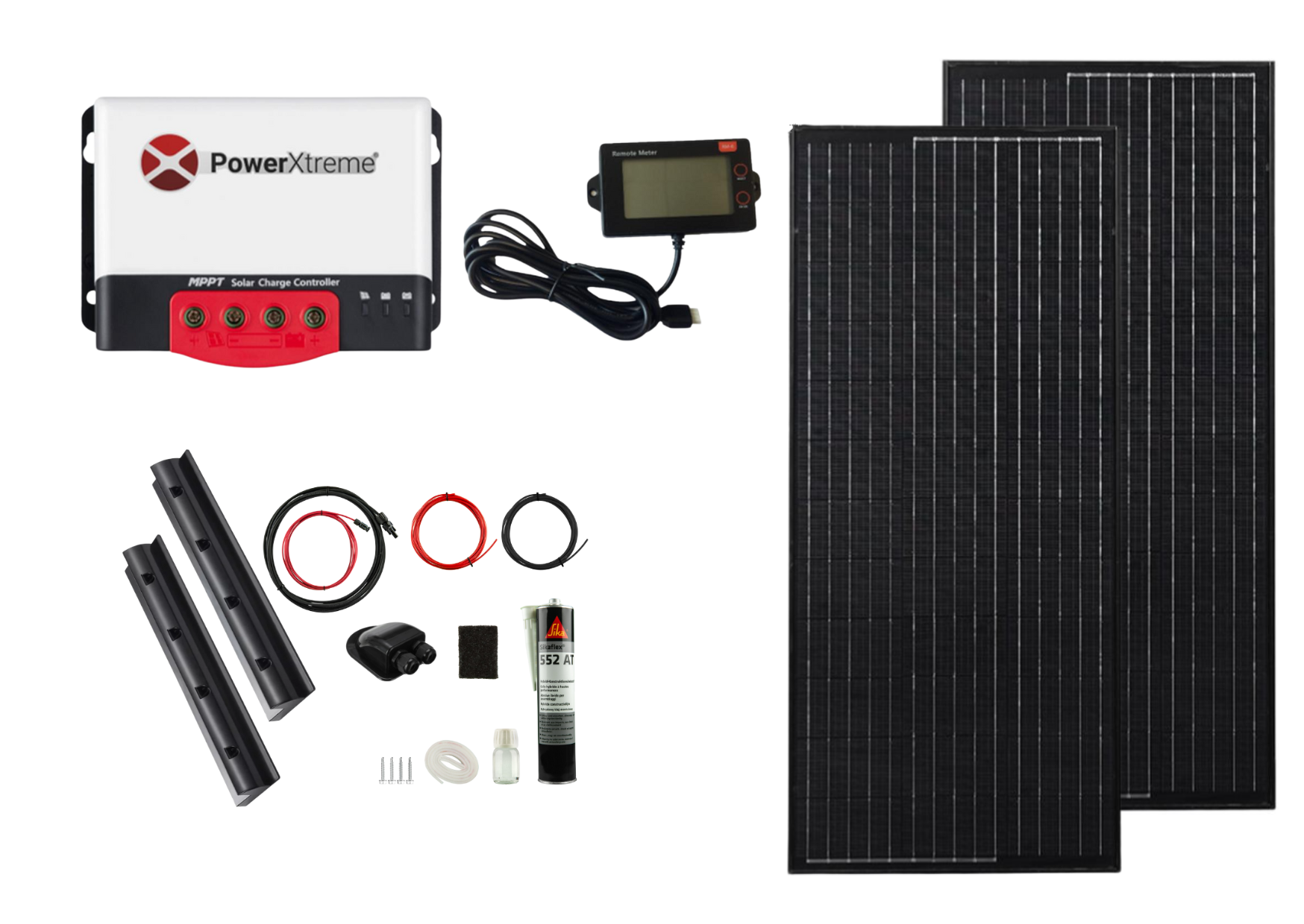 Dieses Paket wird komplett geliefert mit 2 x 140 W schwarzem Solarmodul, schwarzem Spoiler-Set, schwarzer Dachdurchführung für die Verkabelung, Verkabelung und Display